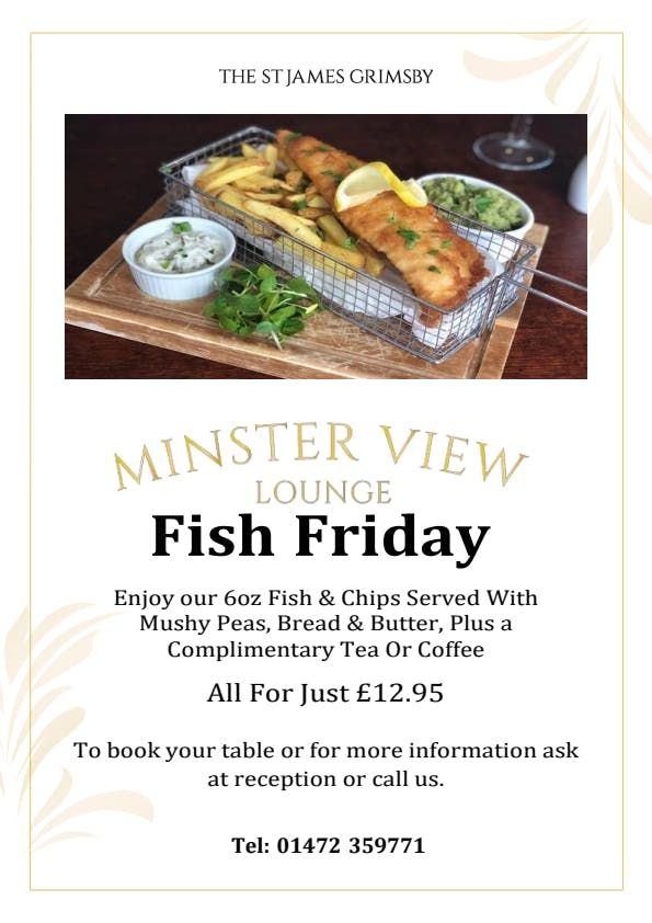 Come to the Minster View Lounge at the end of the week and enjoy Fish Friday! Every Friday, enjoy our 6oz fish & chips served with mushy peas, bread and butter, plus a complimentary tea or coffee, all for just £12.95 per person.